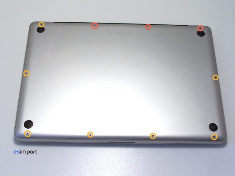 Dévisser avec le tournevis cruciforme, les 10 vis de la coque du macbook indiquées ci-dessous. Bien noter leur position, celles-ci étant de tailles différentes :