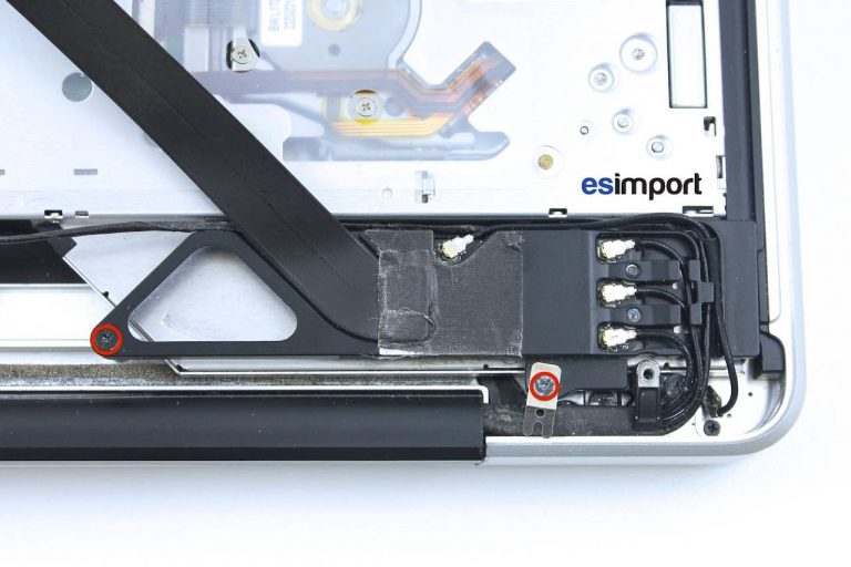 Dévisser les 2 vis cruciformes du berceau des antennes wifi/bluetooth. Il n’est pas nécessaire de le déposer entièrement, il suffit de le basculer simplement vers soi et de le soulever du lecteur optique CD ROM: