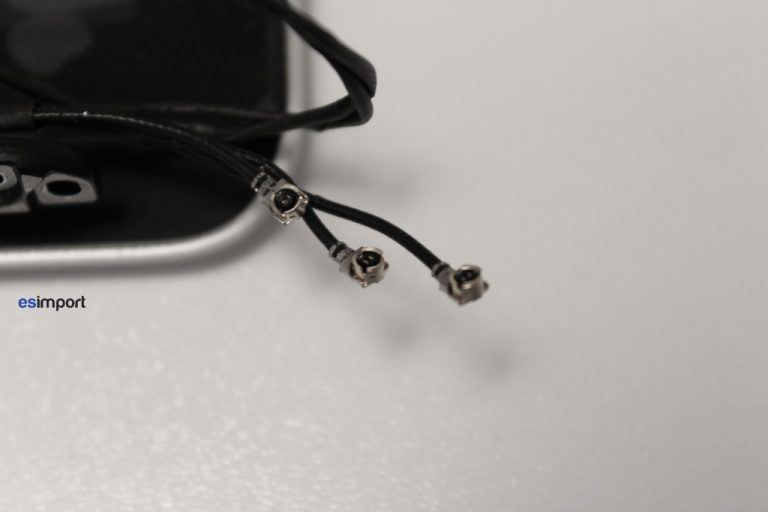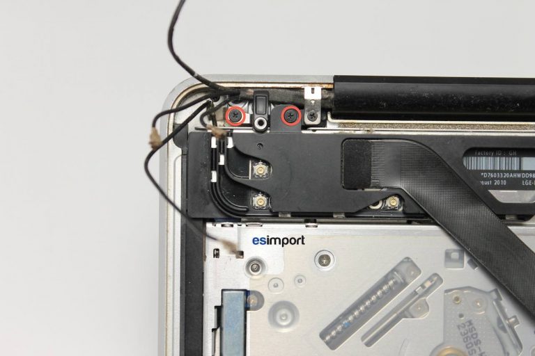 Attention au cheminement des connecteurs WIFI: la longueur des brins devrait être repérée pour déterminer l’ordre de branchement. Utiliser le spudger pour bien placer et enfoncer les câbles dans leur logement :
