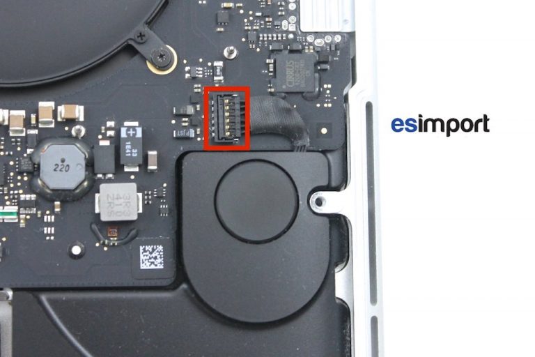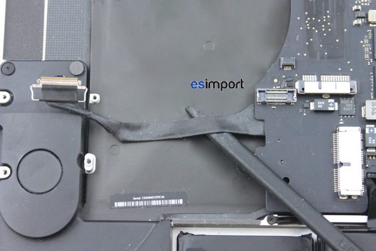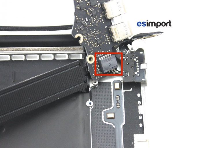 Sous l’adhésif noir se trouvent des connecteurs. Sur la carte-mère du macbook, Déconnecter en premier celui de la batterie afin d’éviter tout court-circuit sur la carte-mère. Déconnecter ensuite le haut-parleur droit ainsi que le trackpad avec le spudger pour ne pas l’endommager :