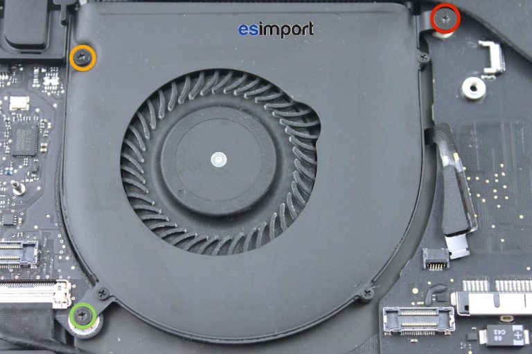 Déconnecter le câble du ventilateur gauche puis retirer les 3 vis qui le fixent à la carte-mère. Bien noter les tailles différentes des vis pour faciliter le remontage. Déposer le ventilateur de la carte-mère :