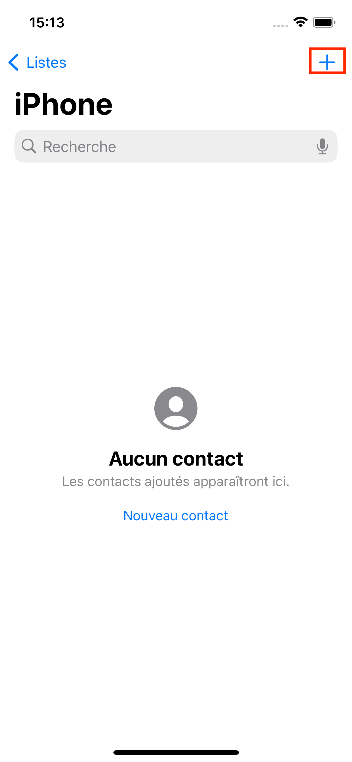 Une fois dans la liste de votre choix, il vous est possible désormais d'ajouter des contacts manuellement sur le ''+'' en haut à droite de l'écran.