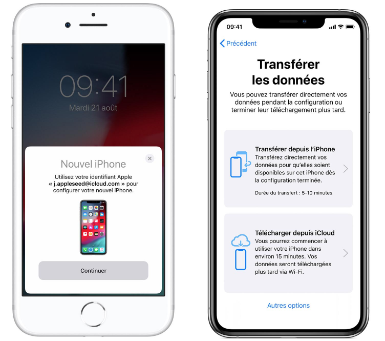 - Le transfert peut également être effectué via Bluetooth lors de la configuration d'un nouvel iPhone, il suffit simplement de placer les iPhones l'un à côté de l'autre, de les brancher sur secteur, une fenêtre apparaitra alors sur l'ancien iPhone pour connecter cet identifiant Apple au nouveau comme ceci :